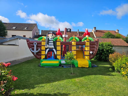 Accueillis par un pirate gonflé de 4 mètres de hauteur, les enfants s'amuseront à jouer aux apprentis pirates, faire la course, jouer à cache-cache, multiplier les positions et les acrobaties pour parvenir au bout de la structure à vitesse grand V. Rebondir, sauter, se défouler, tomber, déraper... toutes les figures acrobatiques sont permises dans ce jeu gonflable protégé qui promet des heures de chahut et des fous-rires illimités... en toute sécurité. Et pour un finish en toute beauté : les enfants pourront grimper puis dévaler un grand toboggan gonflable riche en couleurs. Dimensions : L 8 x P 5.1 x H 4.3 m. Accessible à tous, des tout-petits aux plus grands. capacité maximale : 12 personnes en flux continu..